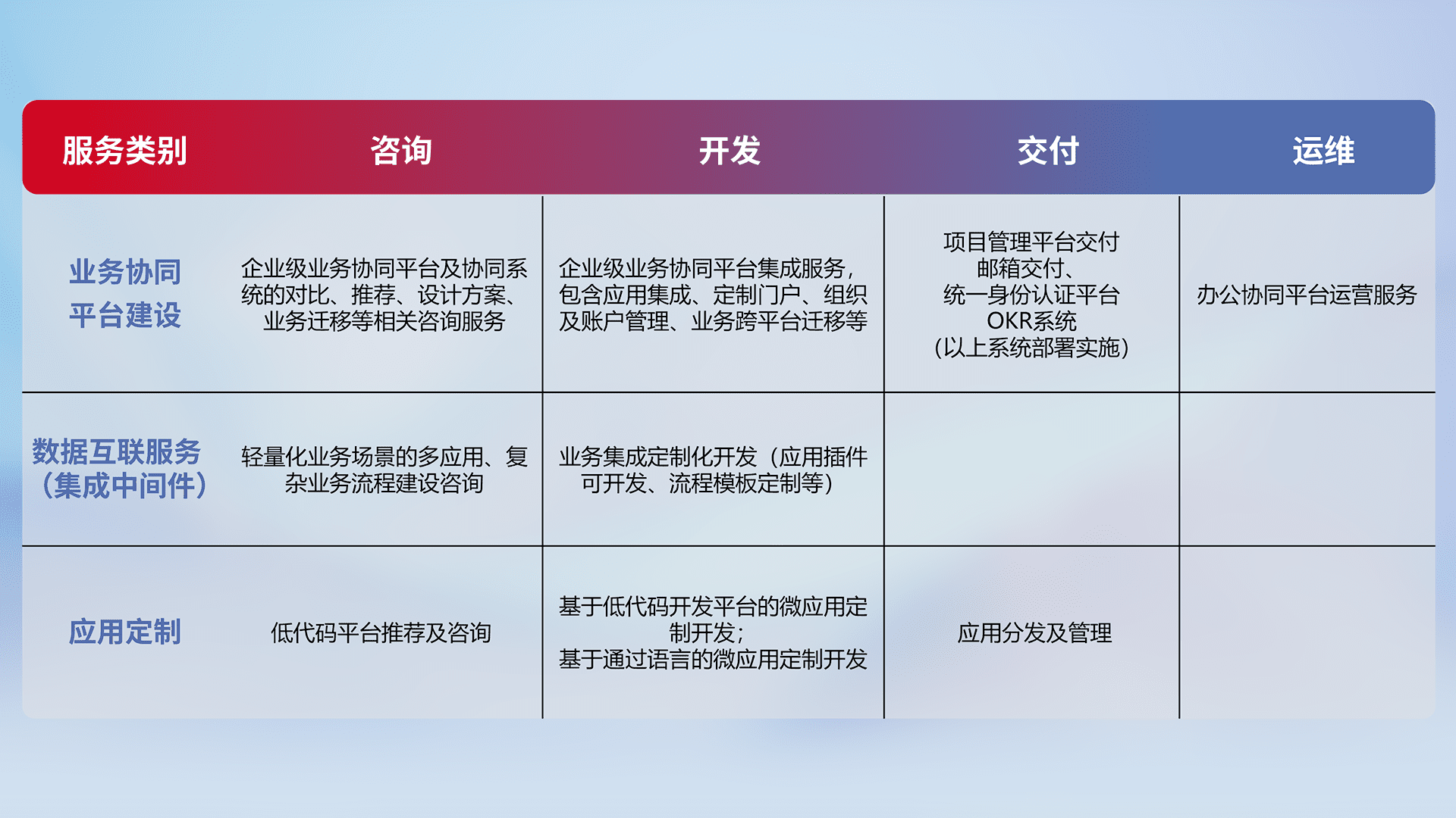 针对钉钉、、、、企微、、、、IDaas等平台级产品提供产品的规划、、、、方案、、、、交付、、、定制化开发等服务,,实现如统一协同办公、、智能客户服务、、、、混合会议管理、、智能数据查询、、、等业务场景,,,实现数字化转型。。